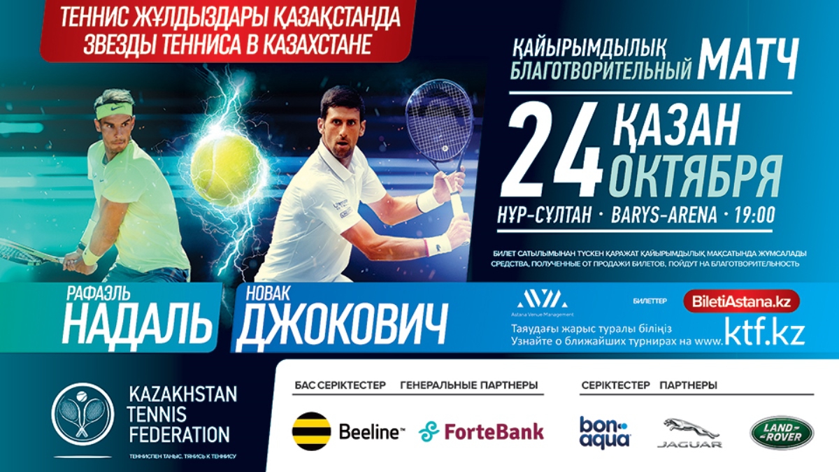 24 октября 2019 года в Нур-Султане в 19:00 на «Барыс-Арена» Федерация тенниса Казахстана организует благотворительный выставочный матч с участием величайших теннисистов современности Новаком Джоковичем и Рафаэлем Надалем. Данное мероприятие является беспрецедентным не только для Казахстана, но и для всего СНГ.